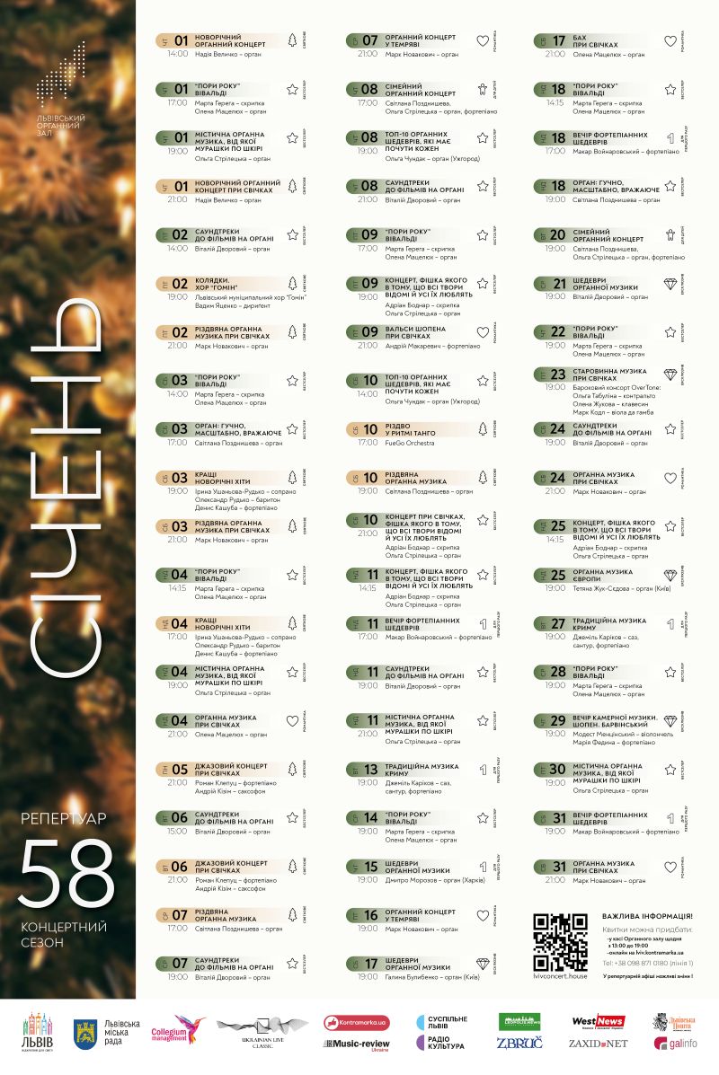 - “Концерт, фішка якого в тому, що всі твори відомі й усі їх люблять” у виконанні Адріана Боднара (скрипка) та Ольги Стрілецької (орган) – 9, 10, 11, 25 січня.